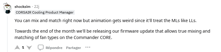 en zoomant chez corsair via leur compte reddit, une info très intéressante d un "cooling product manager" (vérification faite), et qui concerne un mix de ventilo LL/ ML sur un modèle aio identique au tien ( hormis la taille ) mais même gestion.