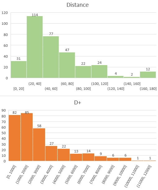 On observe une distance médiane de 42km et un d+ médian de 2000m.
