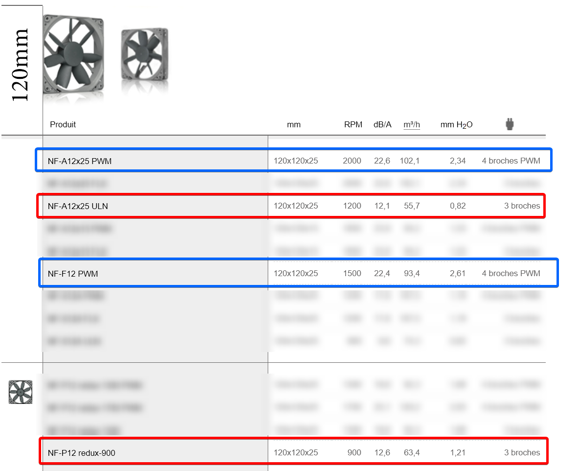 En bleu pour comparer avec les NF-F12, en rouge pour les NF-P12, pour un niveau sonore similaire.