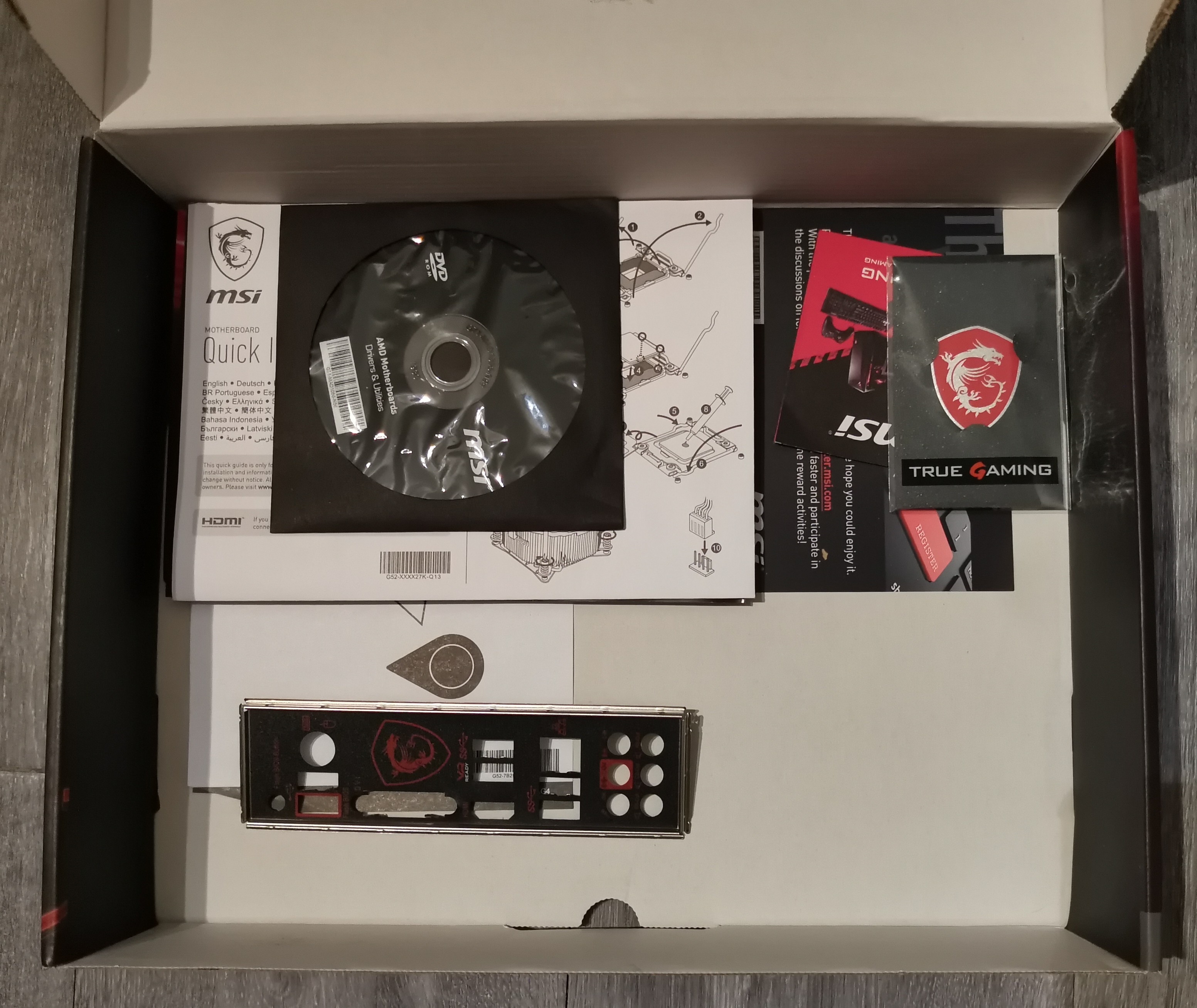 Boîte + manuel + CD + Logo + IO Shield. Manque seulement les câbles sata que j'utilise toujours