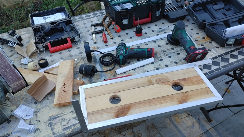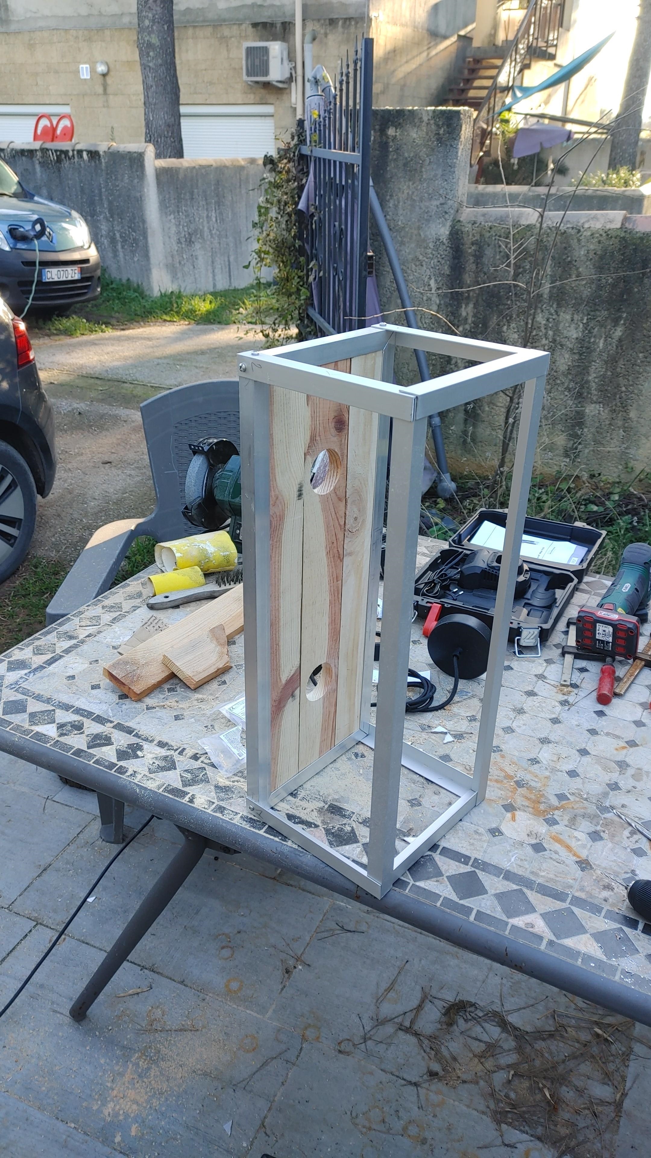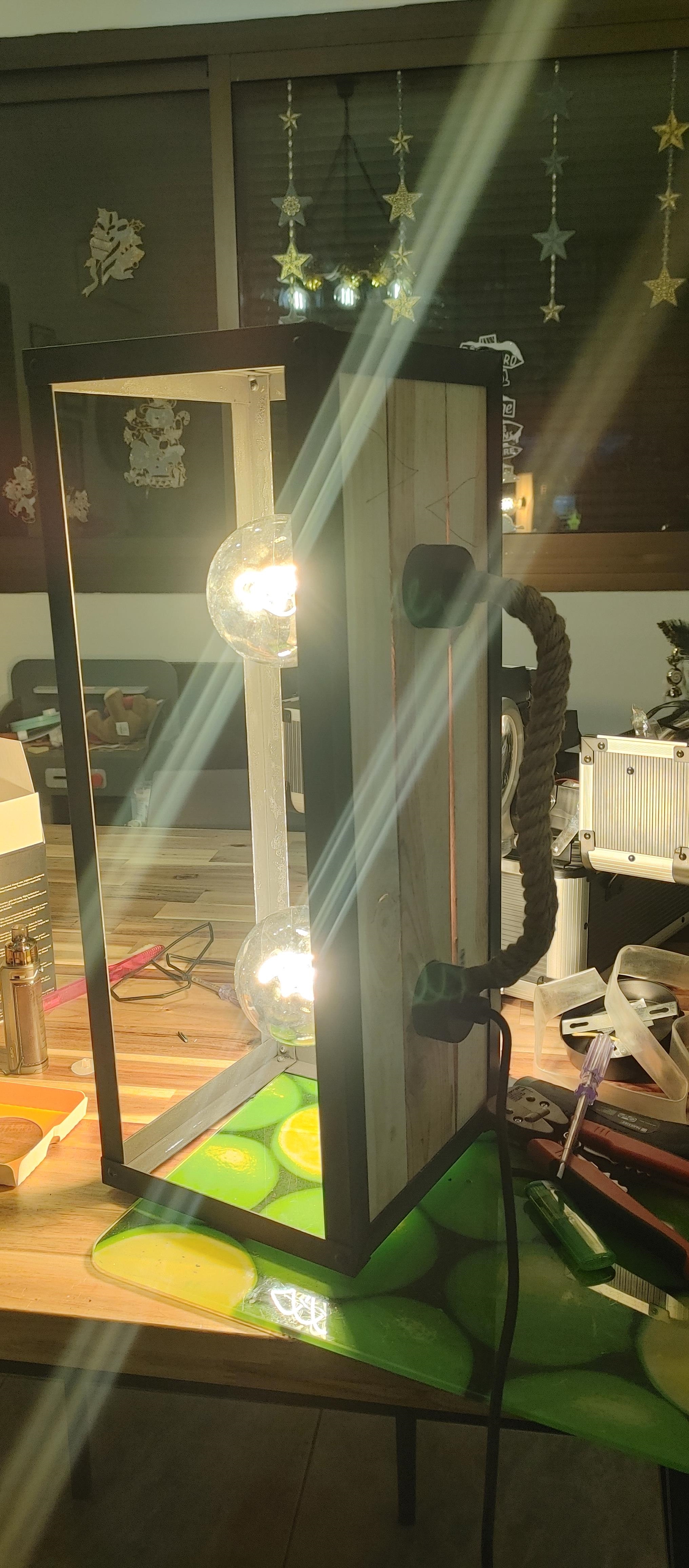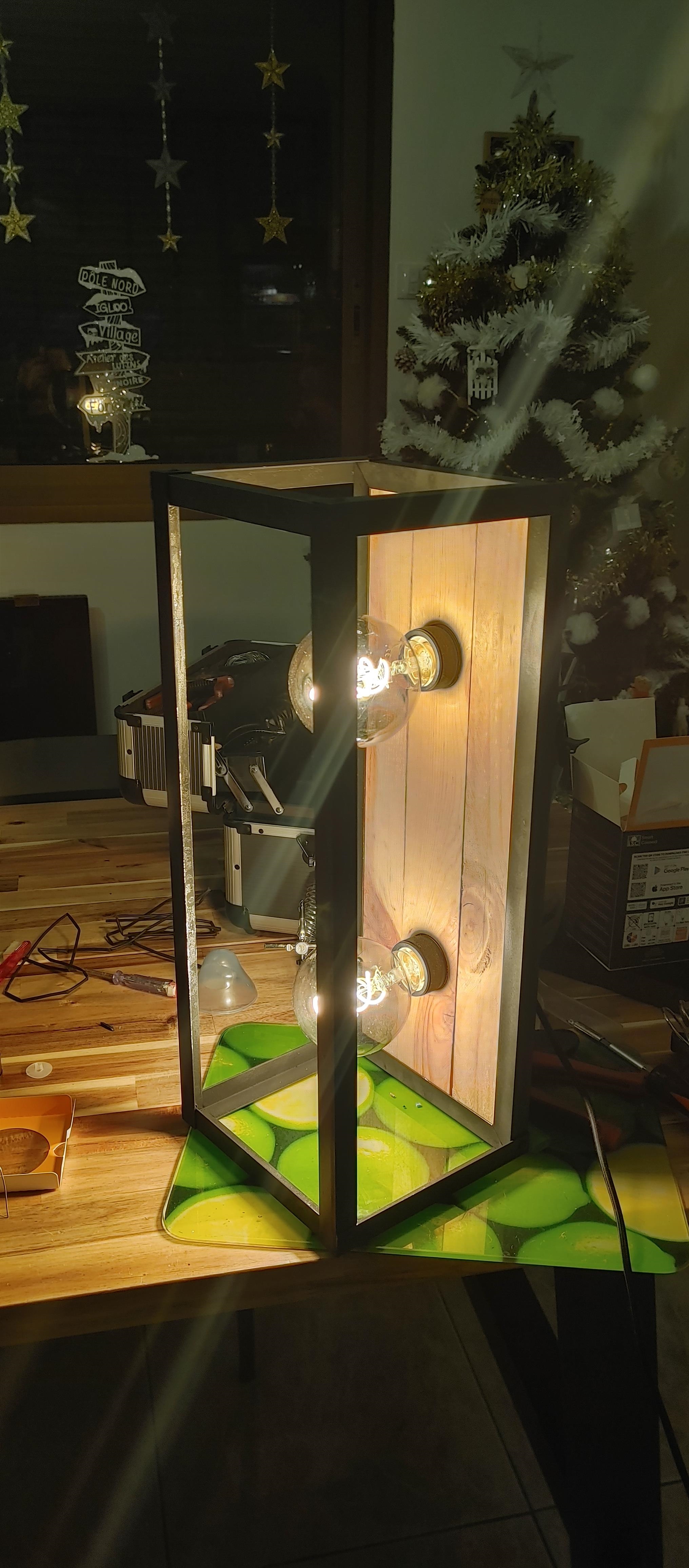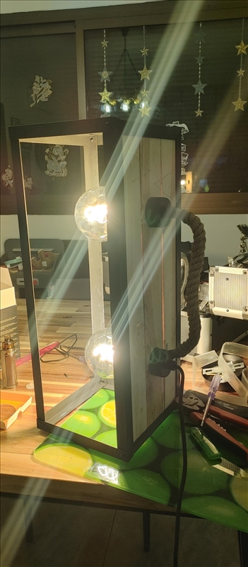 Contexte Aperçue dans un restau, j'ai bien aimé cette lampe (qui existe aussi en version plafond) https://rehost.diberie.com/Picture/Get/r/125769 Mais le style industriel coûte très cher pour ce que c'est à mon goût, du coup j'ai préféré en refaire une, et en plus je la trouve un peu grande, je vais faire une version 2 ampoules. Matière d’œuvre Étapes et choix J'ai commencé par définir la taille globale à peu près en me basant sur la partie la plus exploitable, propre et droite, des 3 planches utilisées, coupées rapidement à la scie à onglet puis ajustées en épaisseur et longueur avec la ponceuse à bande Puis j'ai coupé les profilés alu en U en 4 morceaux pour en faire un cadre, gros avantage du style indus, ça se fait à main levée avec un brin de dextérité, pas besoin d'outillage de précision (que de toute façon je ne possède pas) Je vous passe la découpe et ajustement des trous à la scie cloche. https://rehost.diberie.com/Picture/Get/r/125767 Découpe et assemblage à blanc du reste de la "cage" en profilé L https://rehost.diberie.com/Picture/Get/r/125770 Peinture de tous les profilés et des vis https://rehost.diberie.com/Picture/Get/r/125771 Assemblage à l'aide des vis du cadre autour des planches, prenant en sandwich le reste de la cage elle-même assemblée à l'aide de rivets Installation et modification des douilles en aluminium (rentrées en force), câblage, ajout de corde autour du fil reliant les douilles Et voilà le résultat final https://rehost.diberie.com/Picture/Get/r/125772 https://rehost.diberie.com/Picture/Get/r/125773 Une fois à sa place : https://rehost.diberie.com/Picture/Get/r/125774